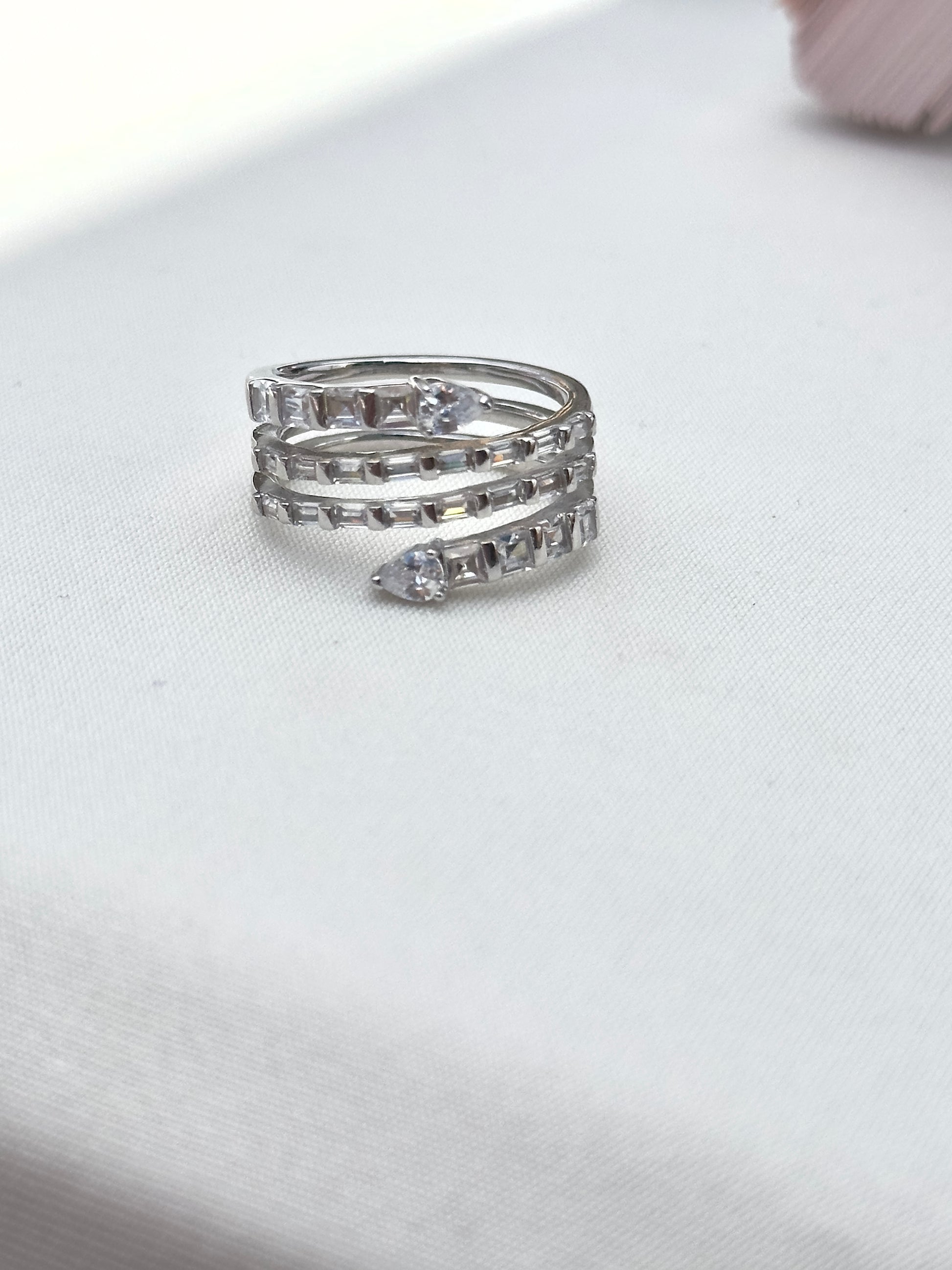 Presenting the exquisite Baguette Wrap Around Silver Ring - a timeless, sophisticated wrap ring adorned with dazzling cubic zirconia stones. An essential addition to any jewelry assortment and a perfect present for any momentous event. * Stainless steel * CZ stones * Resistant to allergies and tarnishing.