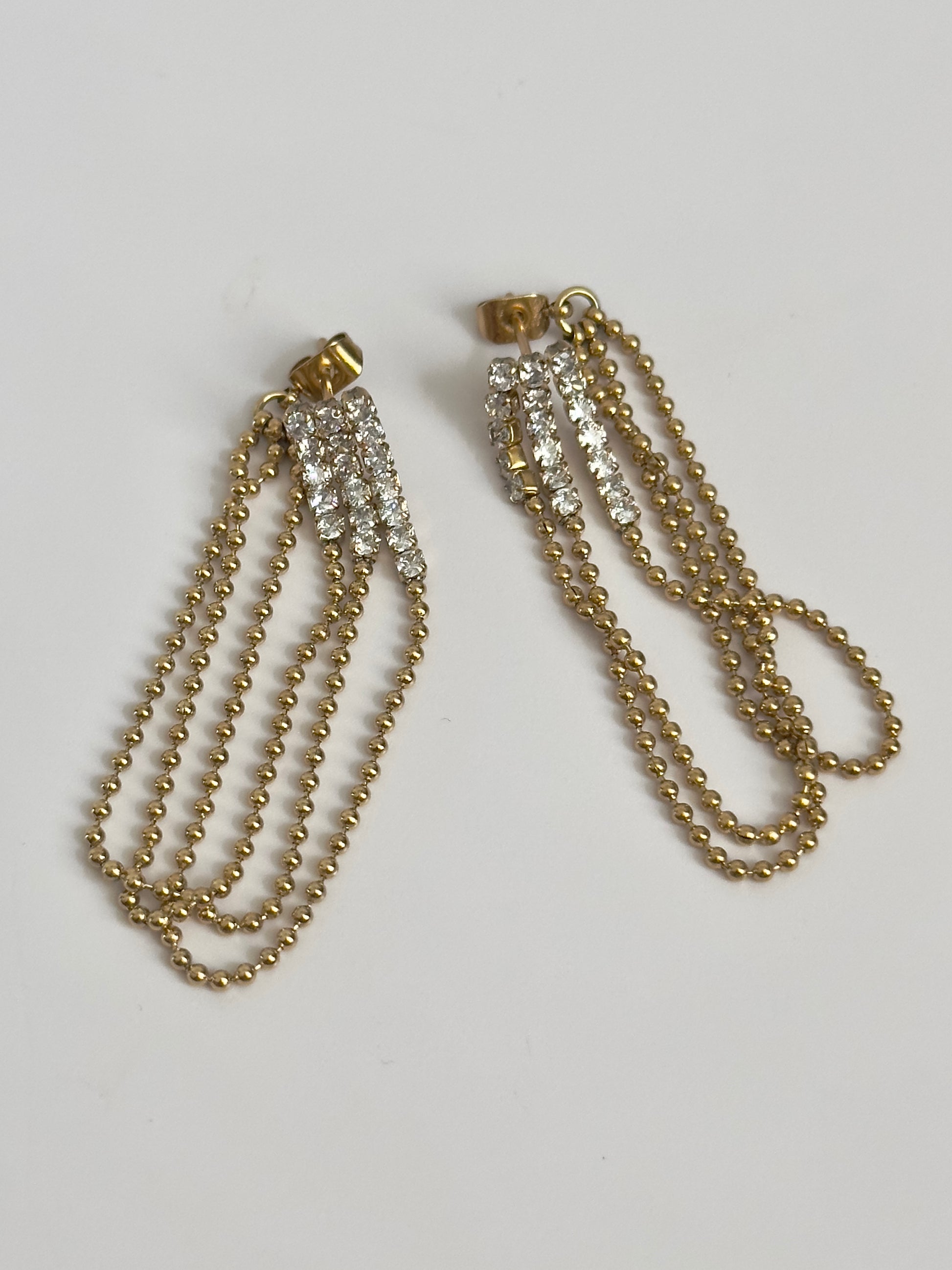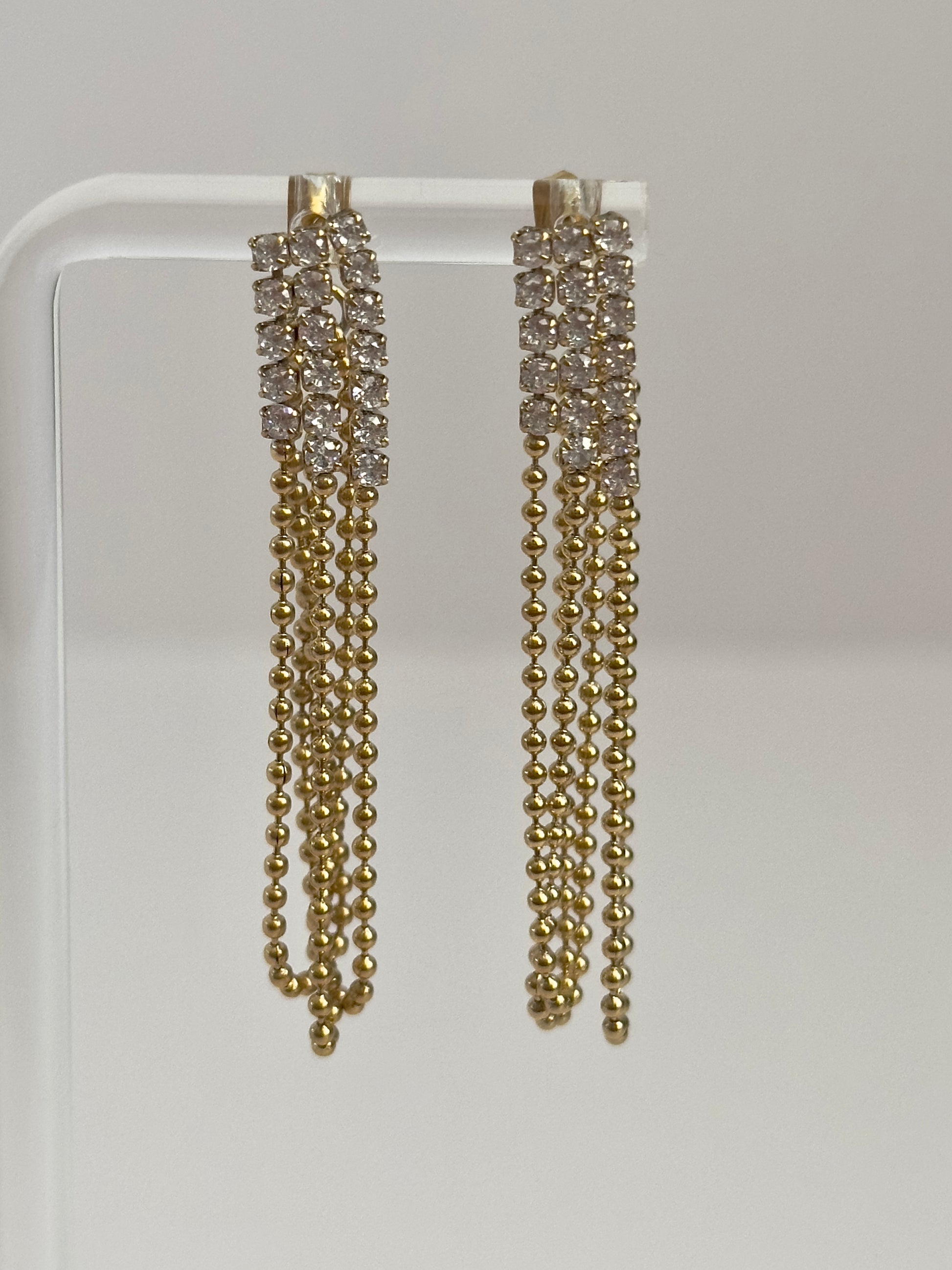 ONLY 1 PAIR LEFT! Exquisite 2" drop earrings adorned with delicate gold beads, sparkling CZ stones, and a playful dangle design. Crafted with 18k gold plating, these earrings are a one-of-a-kind addition to your collection.