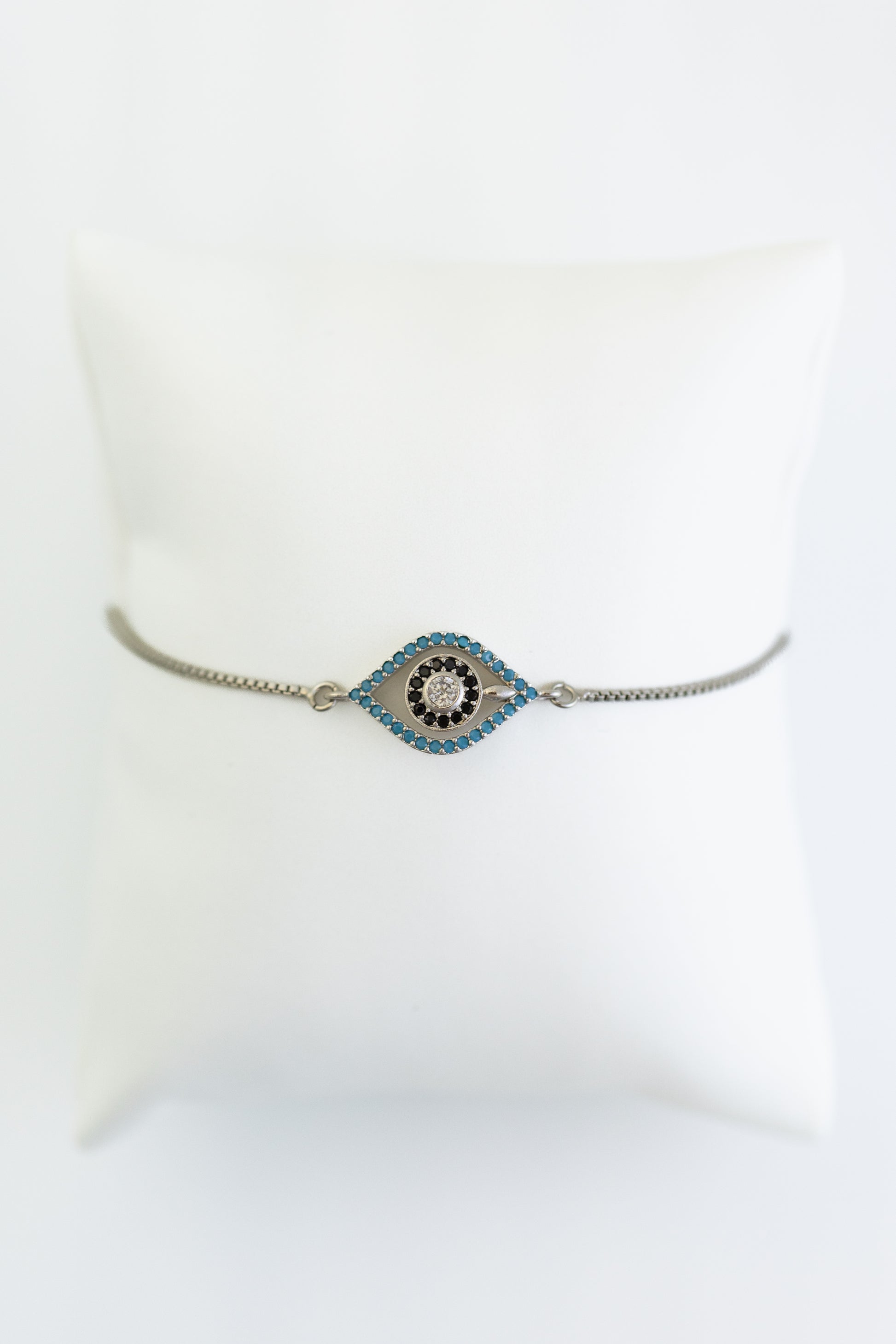 Treat your wrist to some serious sparkle with this fabulous evil eye bracelet that's as versatile as you are. The clever beaded slider adjusts to fit any wrist size perfectly—no more loose or tight situations. Wrapped in gorgeous Sterling Silver plating, this playful piece brings both style and a touch of protective charm to your everyday look.