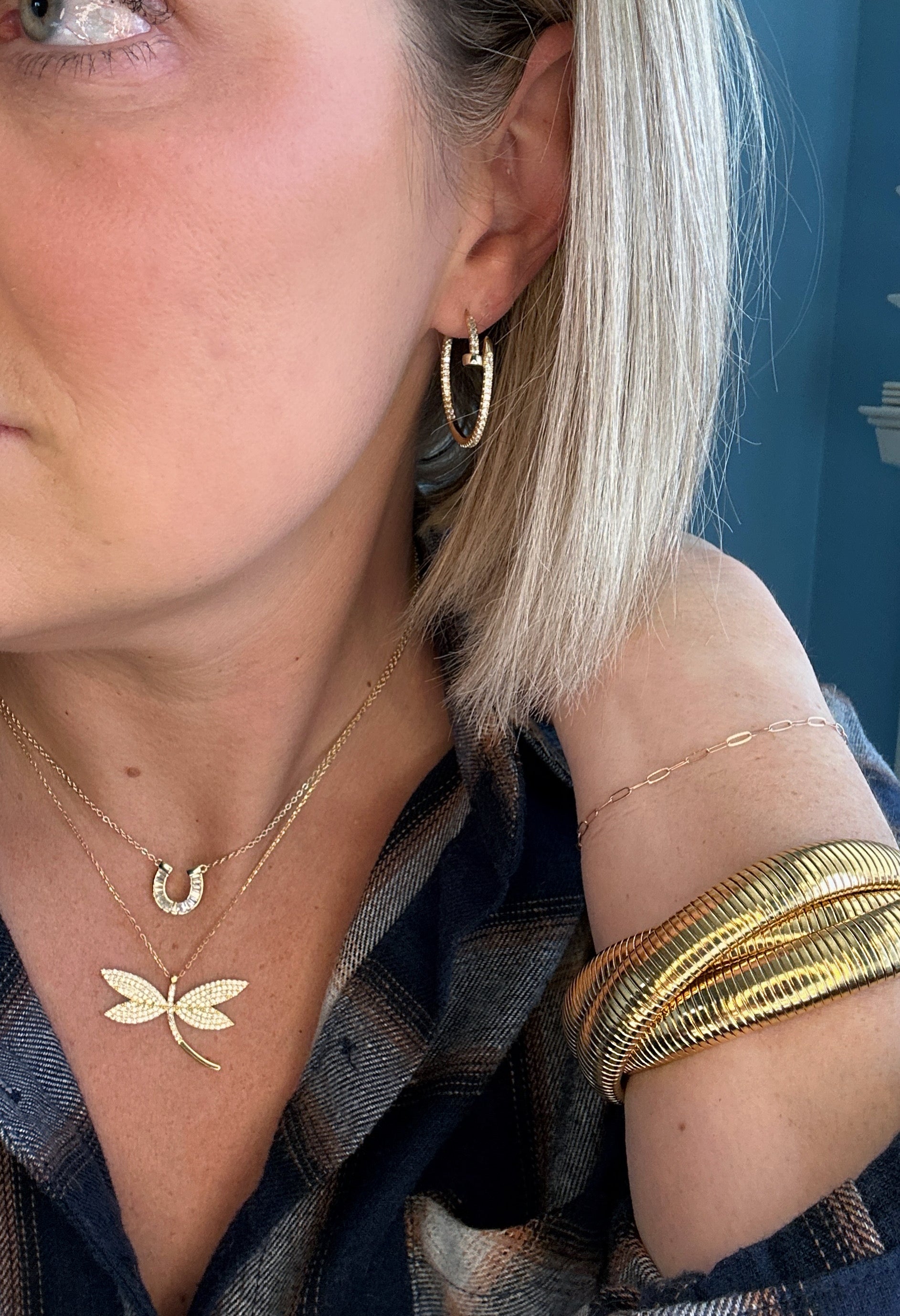 Get ready to dazzle with the stylish yet sophisticated Steel-plated 22K Diamond Nail Gold Hoop! CZ stones adorning both the inside and outside of the hoop design make for a pave that sparkles in all directions.