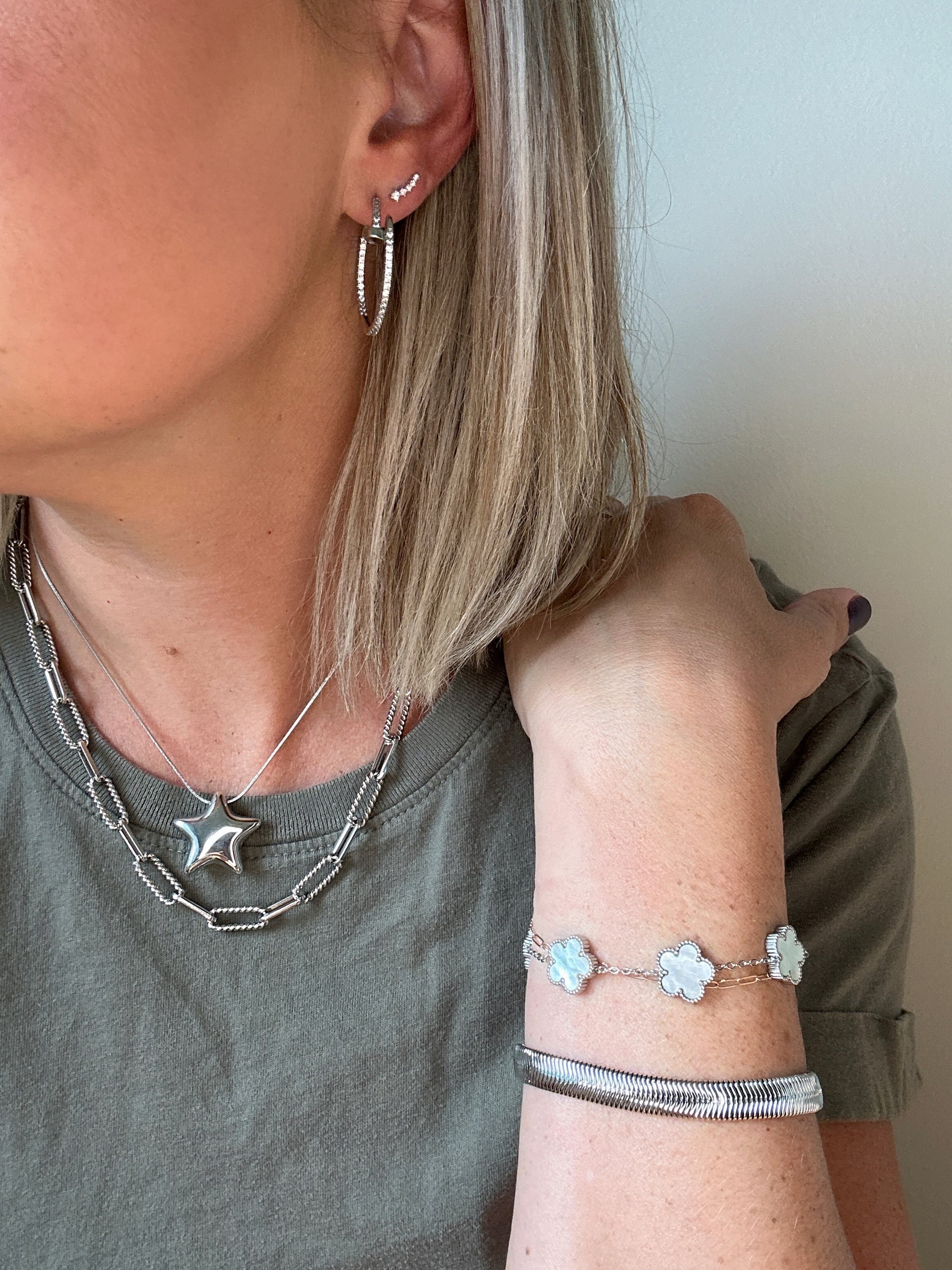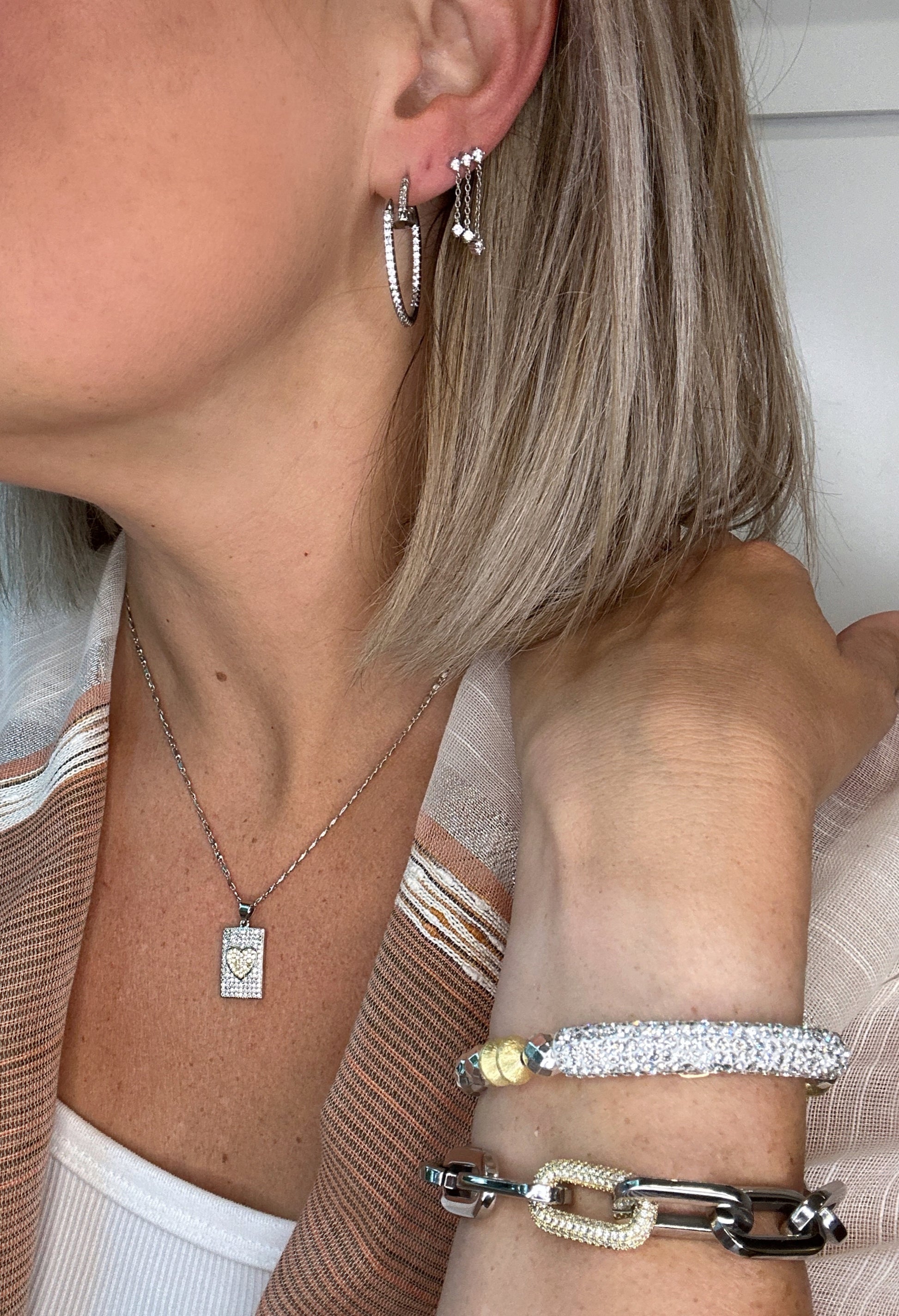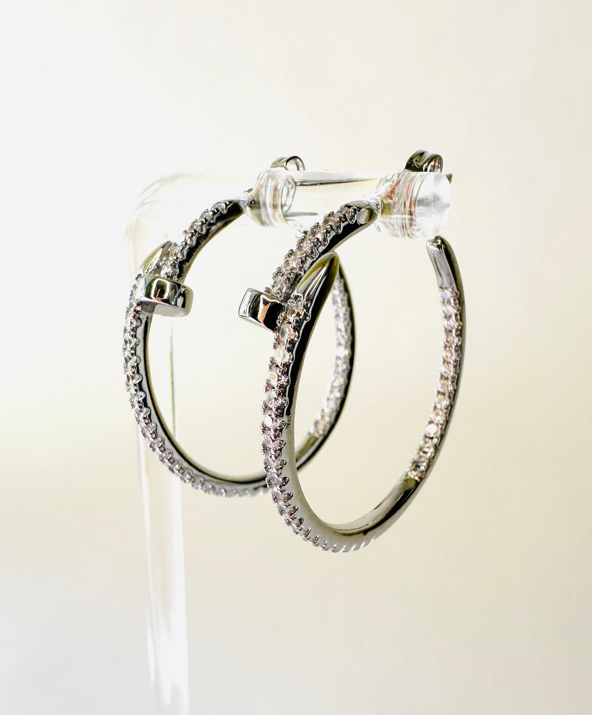 ONLY 1 PAIR LEFT! Get ready to dazzle with the stylish yet sophisticated Steel-plated 22K Diamond Nail Silver Hoop! CZ stones adorning both the inside and outside of the hoop design make for a pave that sparkles in all directions.