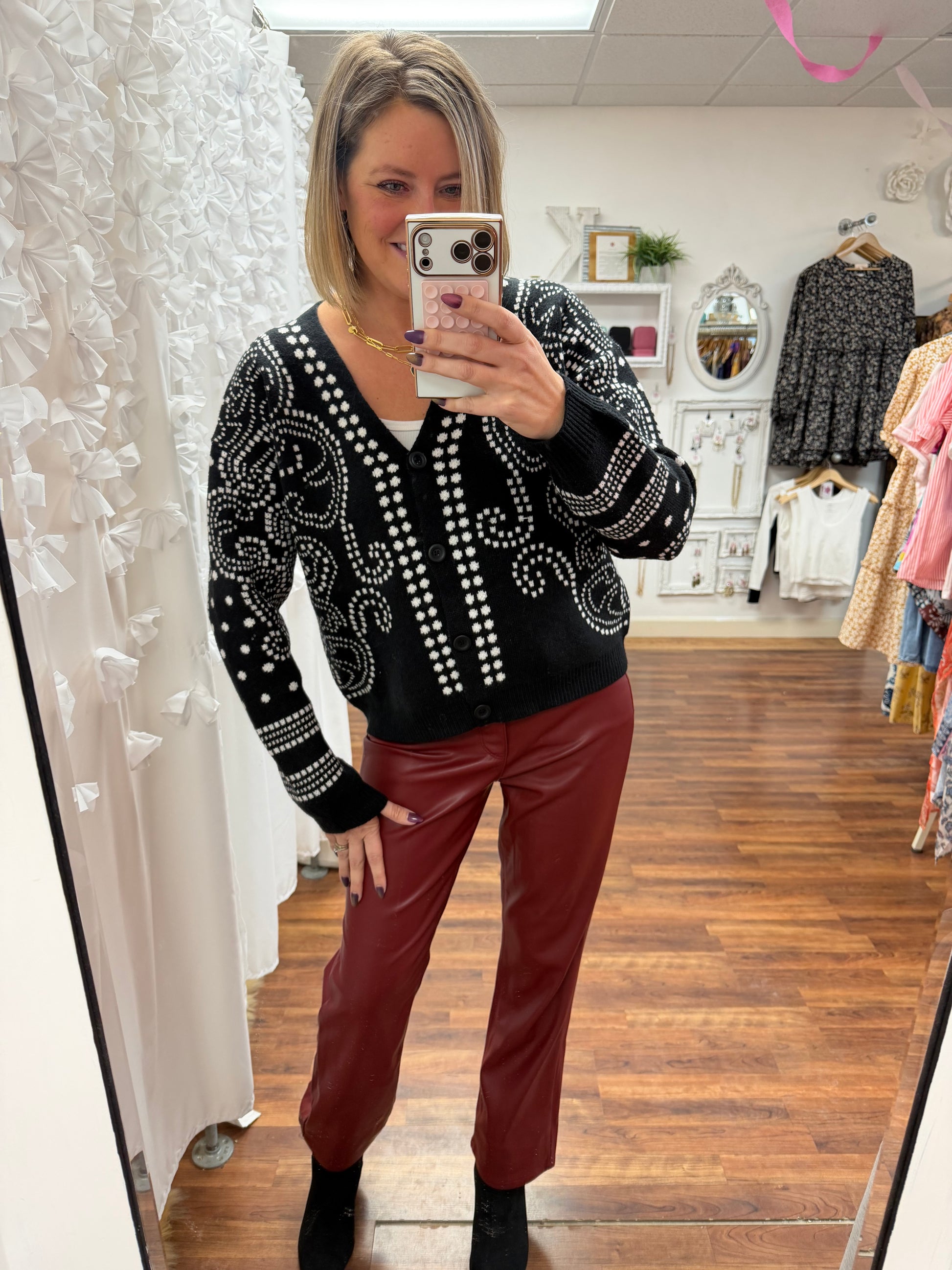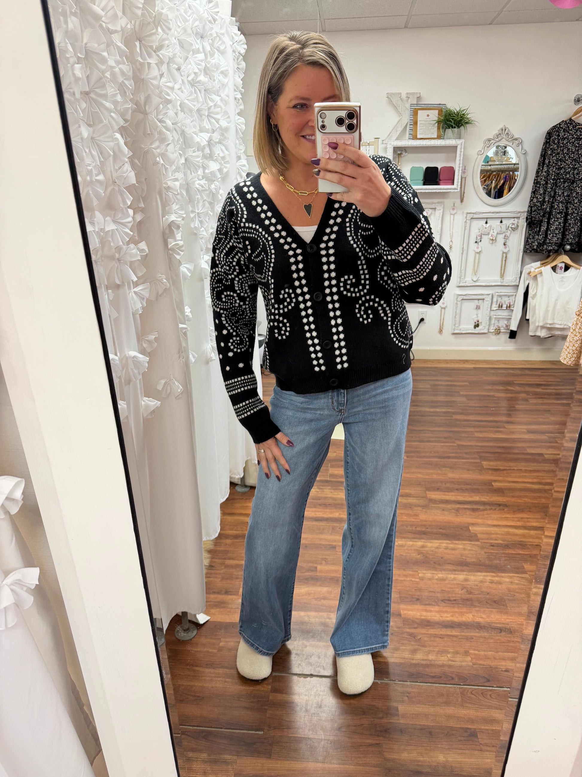 This charming cardigan brings a whimsical twist to your everyday wardrobe with its eye-catching dot art damask pattern throughout. The relaxed V-neckline and button-down front make layering effortless, while long sleeves finished with cozy ribbed cuffs keep you comfortable. A ribbed hem provides a polished, structured silhouette. Perfect for adding personality to any outfit!