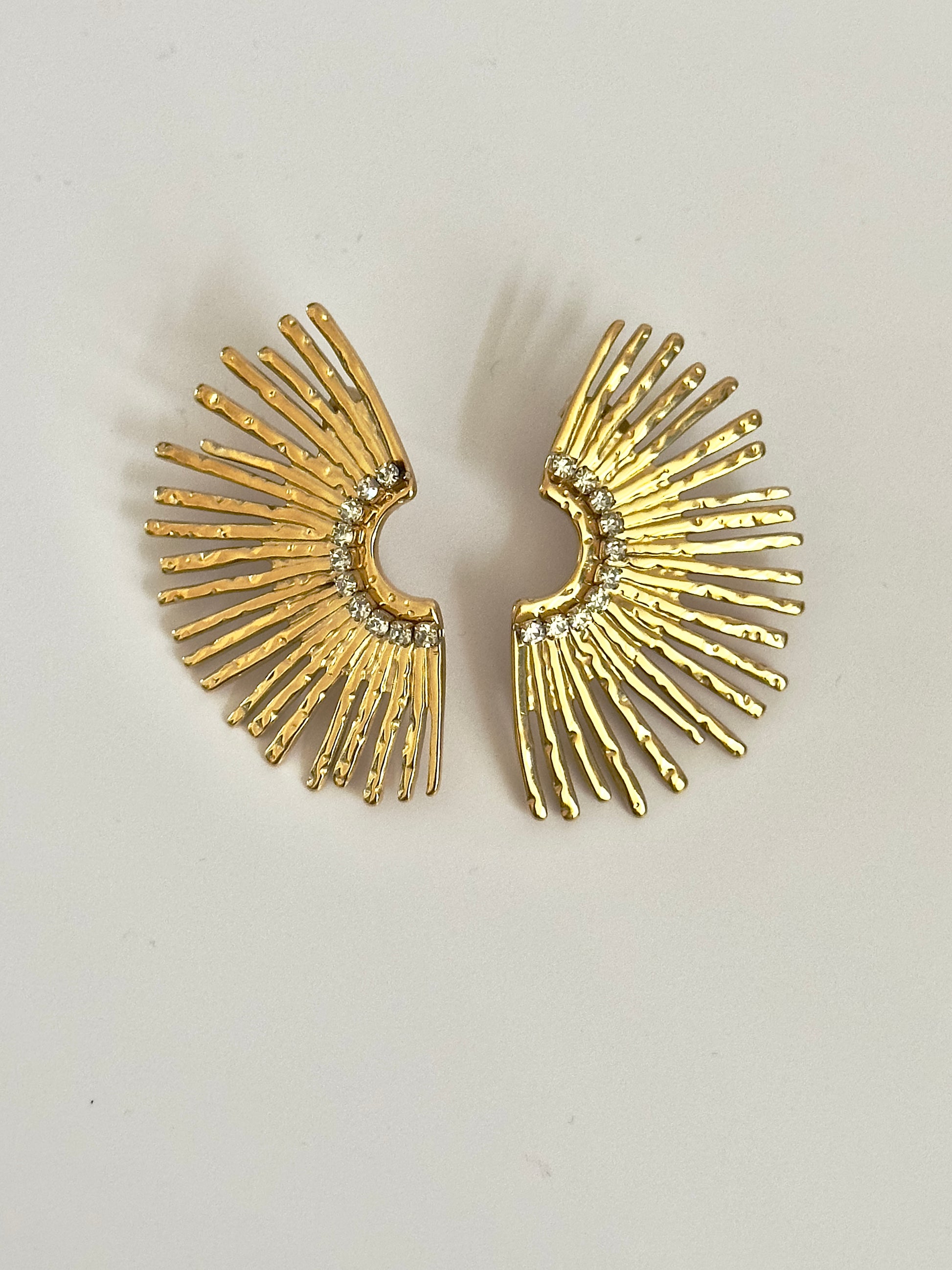 Make a grand entrance with these show-stopping 1.5" gold fan earrings, where sparkle meets sophistication. Adorned with glittering rhinestones and crafted for comfort, these lightweight beauties are your ticket to turning heads. Perfect for adding that extra dash of glamour to any outfit, they're the kind of statement pieces that say "I've got style and I know it."