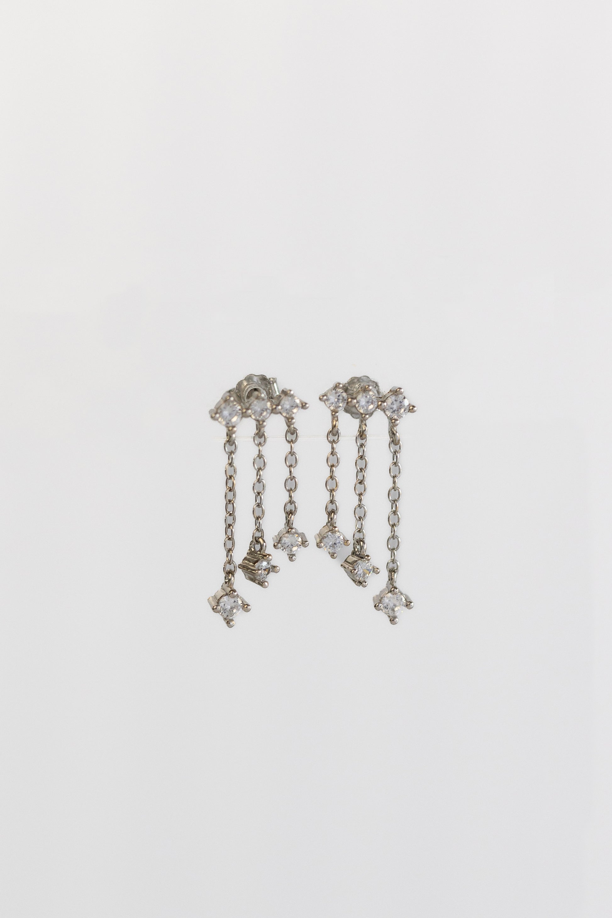 These sophisticated multi-tier dangle earrings feature a luxurious 22-karat silver-plated finish paired with carefully positioned stone accents throughout the chain design. The layered construction creates dimensional movement and visual interest, while the precious metal coating ensures lasting brilliance. A timeless piece that seamlessly transitions from everyday wear to special occasions, delivering both refined elegance and contemporary appeal.
