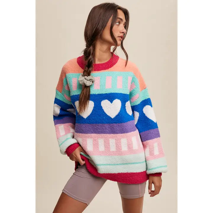 Wrap yourself in cozy comfort with this delightfully soft sweater that feels like snuggling in your favorite blanket. Available in a vibrant mix of colors, it's the perfect playful piece to celebrate Valentine's Day or brighten any ordinary moment. Sweet, squishy, and undeniably charming—this fuzzy favorite brings instant warmth and whimsy to your wardrobe.