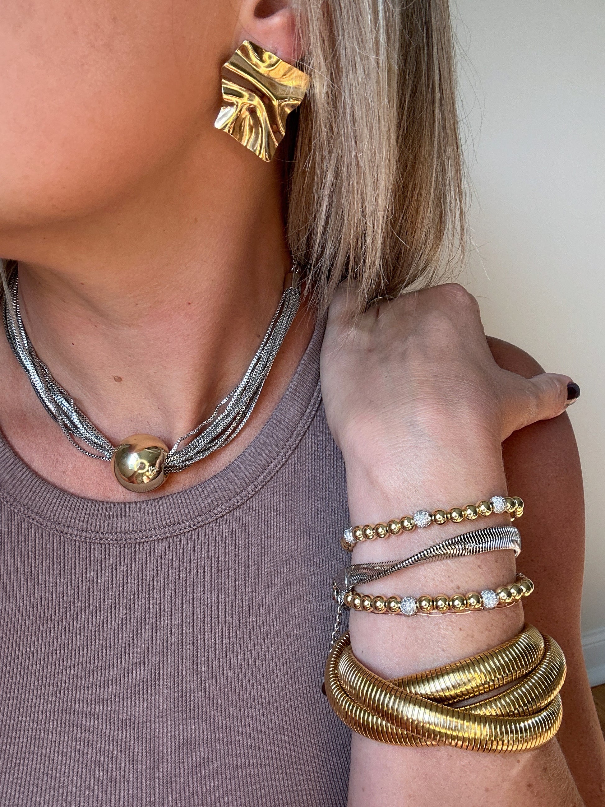 A luxurious necklace that combines the warmth of gold with the sophistication of silver. Adorned with multiple gold strands and a striking silver ball accent, this piece exudes exclusivity. It boasts an exquisite 18k gold plating and can be easily adjusted to a length of up to 18 inches.