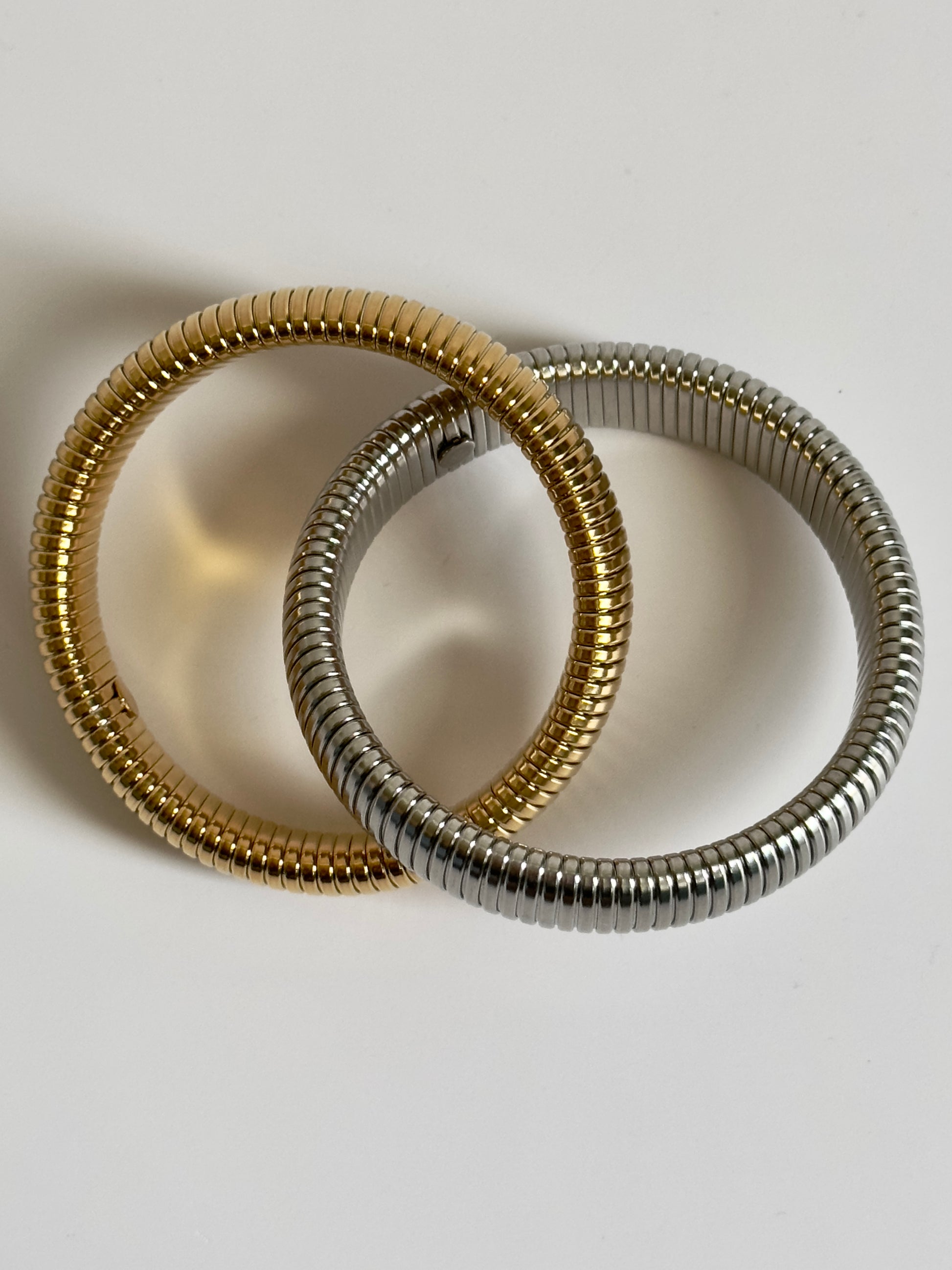 Mix up your wrist game with this stretchy bracelet that blends gleaming gold and silver tones in one playful twist. The gold-plated finish keeps things shiny and chic, while the flexible fit means it slides on effortlessly and stays put all day long. Perfect for stacking or wearing solo—either way, you're bringing the sparkle.