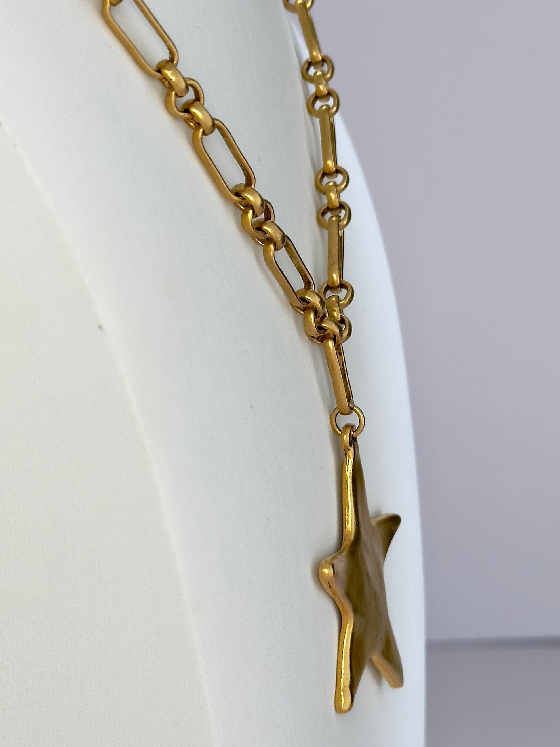 ONLY 1 LEFT! Enhance any outfit with vintage flair using our Luminary Star necklace. The striking antique gold star serves as a statement piece, ensuring you shine wherever you go. Its one-of-a-kind chain adds a unique touch to this essential accessory. Illuminate your look with our Luminary Star necklace. 25” length Antique gold plated Pewter: use a soft polishing cloth for maintenance Not water proof!