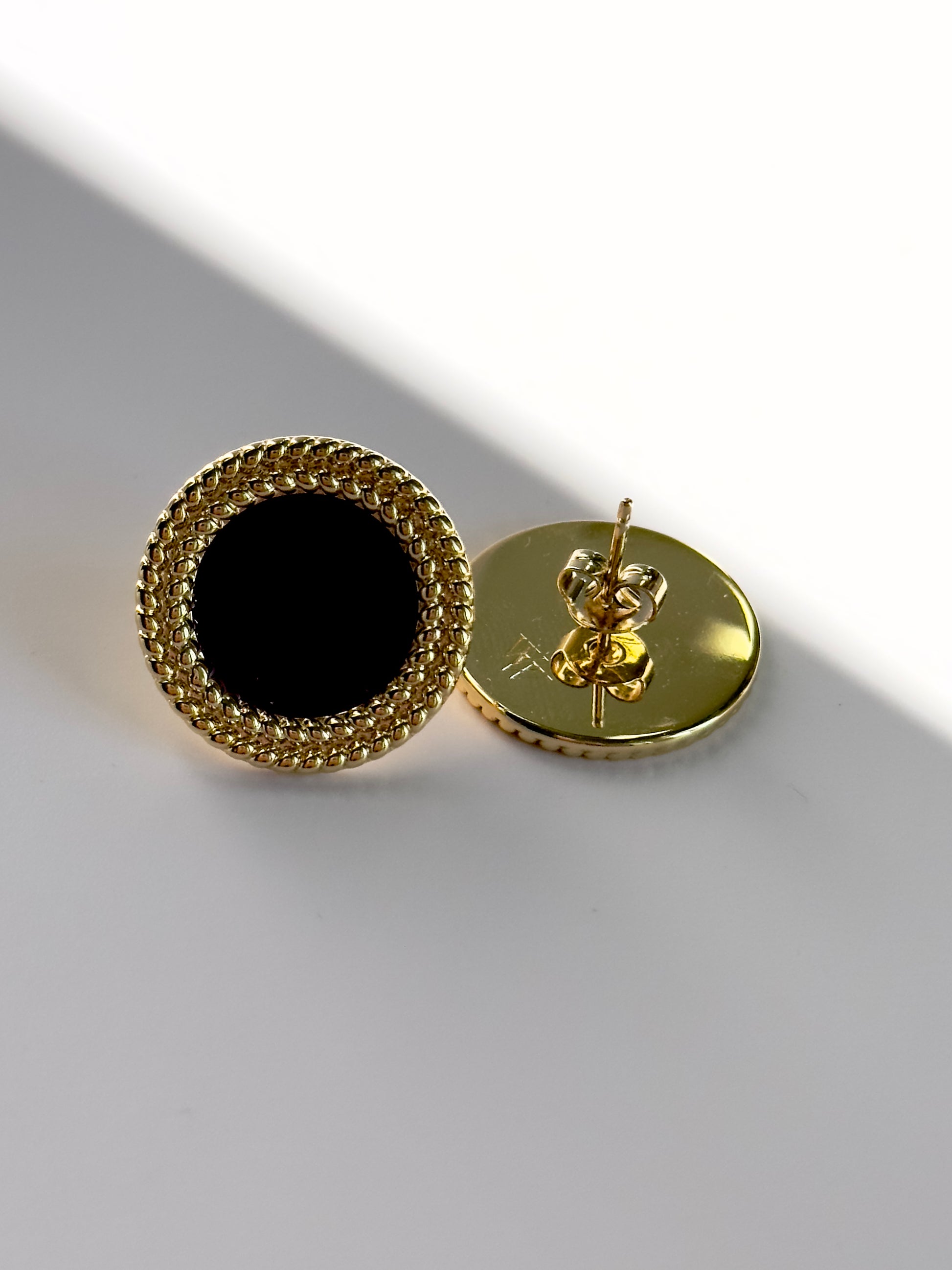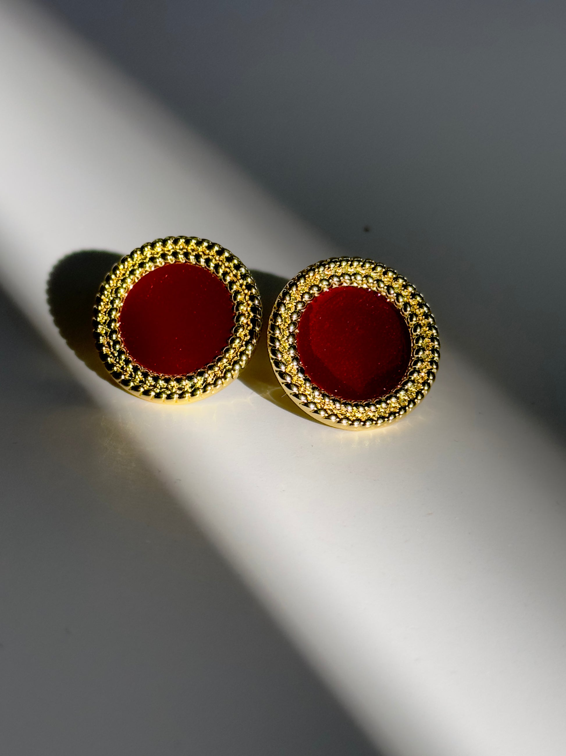 Crafted with brass, coated in 14K gold and Rhodium, these 3/4" round earrings feature a luscious maroon hue and a textured gold border. Embodying luxury and sophistication, these earrings are sure to add a touch of elegance to any outfit.