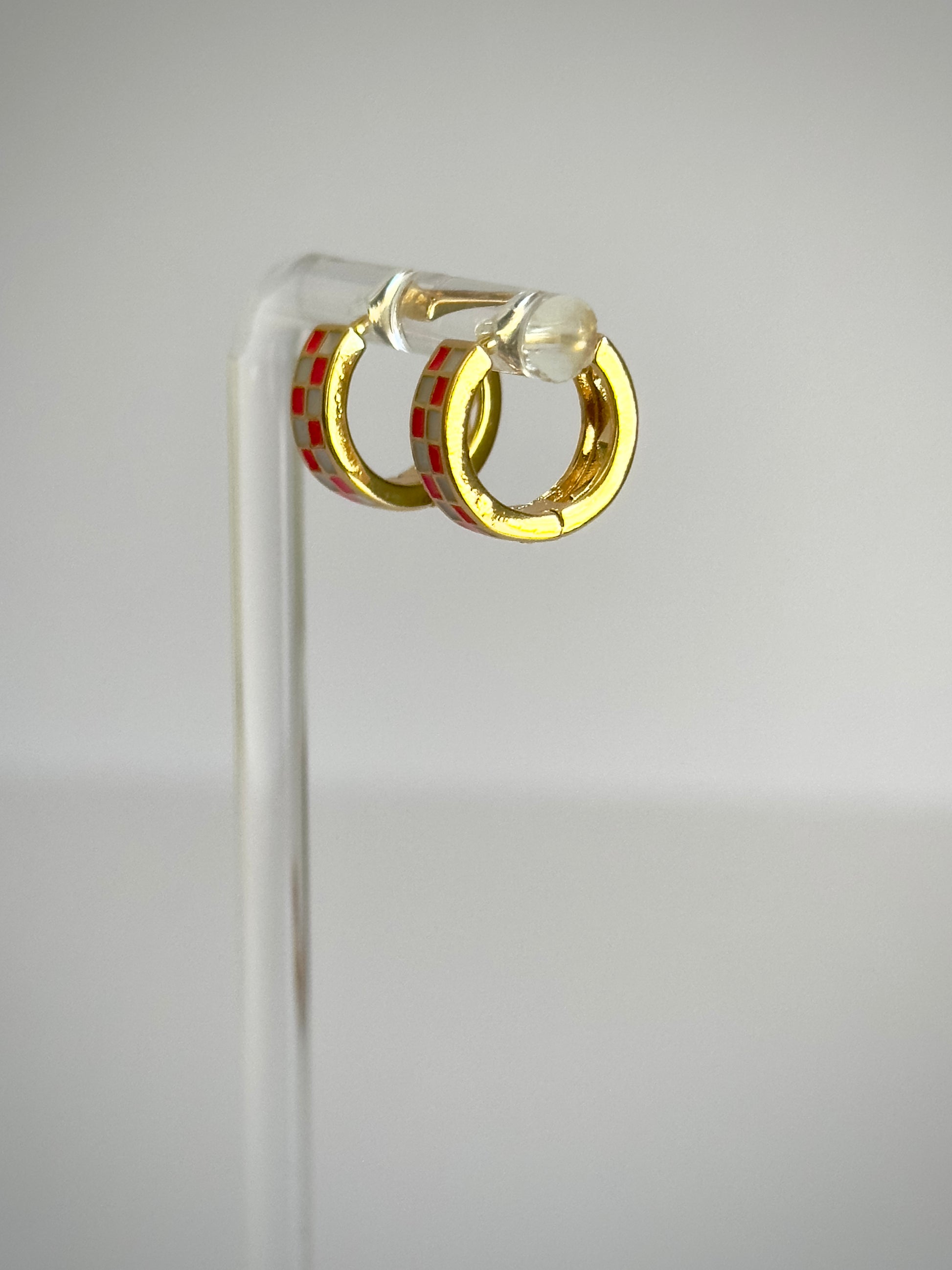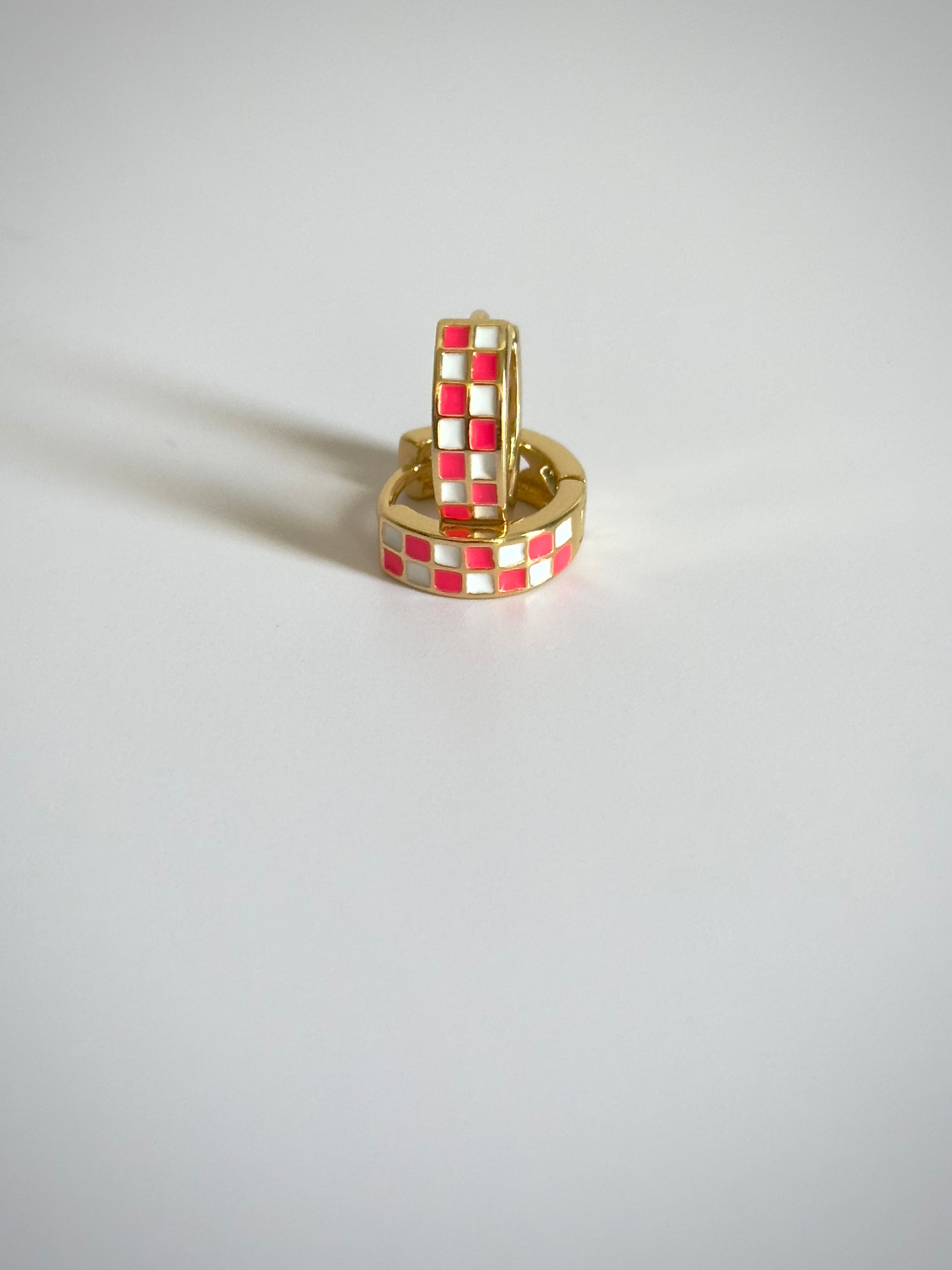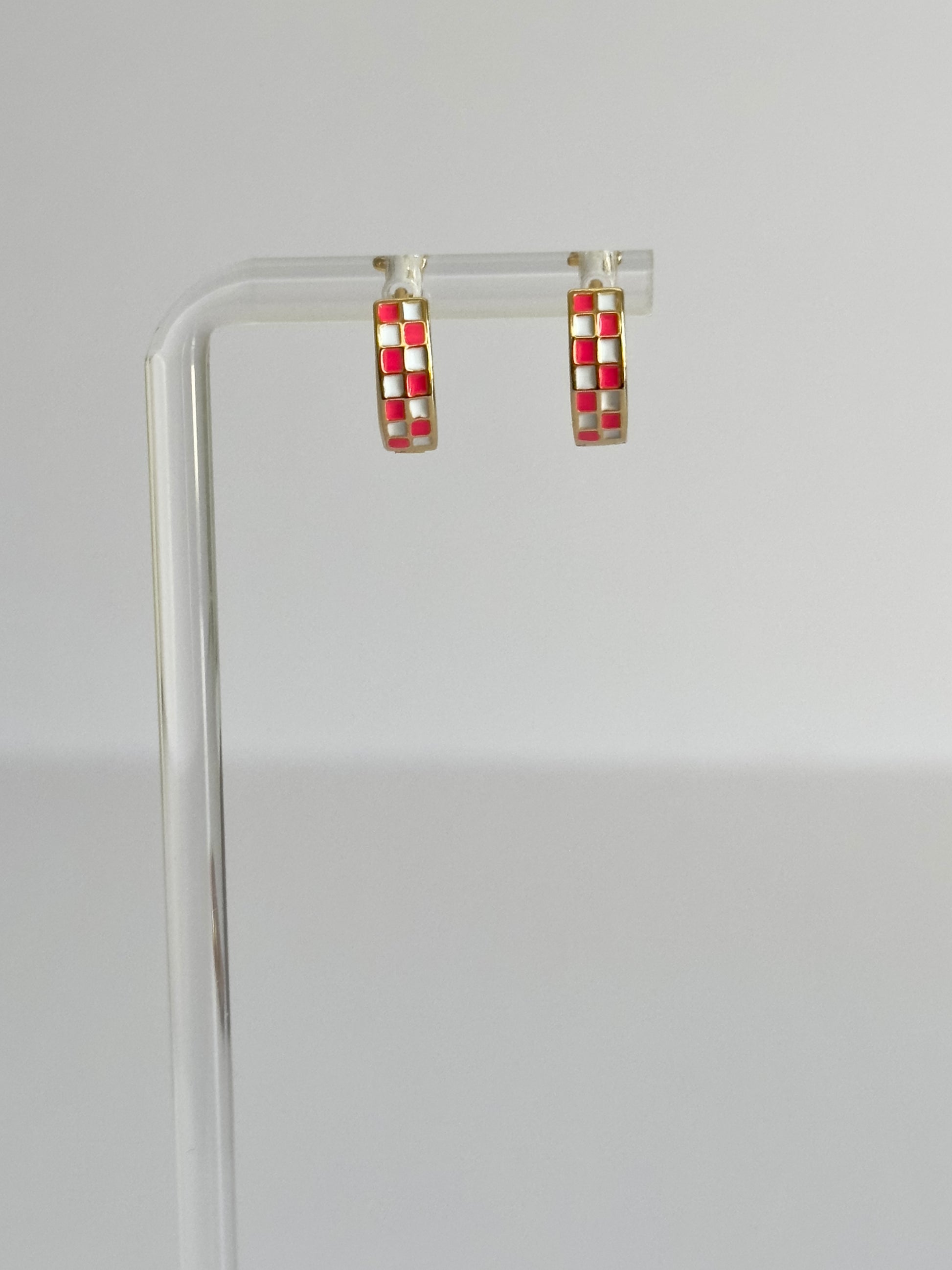 ONLY 1 PAIR LEFT! Stay comfortable and stylish all day long with these pink and white checkered huggies. The gold-filled material makes them hypoallergenic for sensitive ears, so you can show off your fashion sense without any worries. These huggies are the perfect combination of quality and trendiness, allowing you to rock them with confidence.