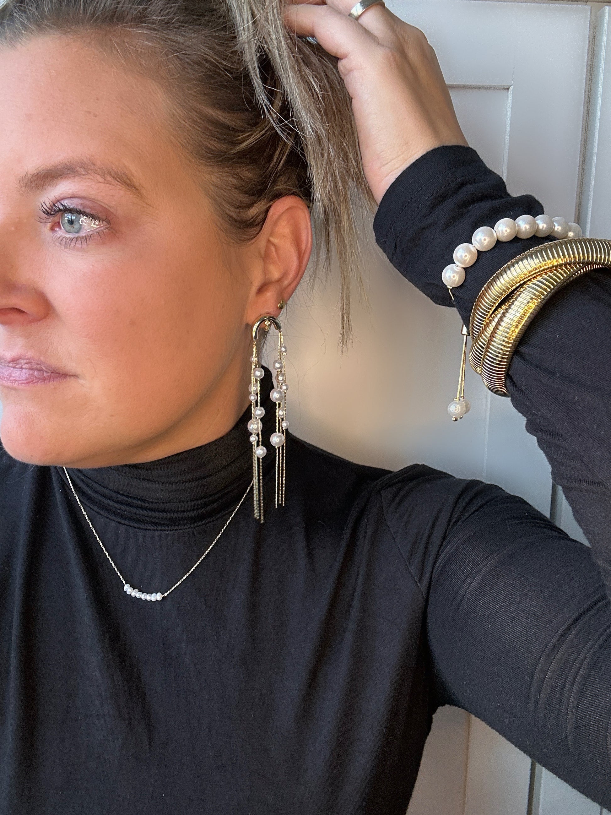 ONLY 1 PAIR LEFT! Experience the glamour and beauty of our 18k Gold-Plated 4" Earrings, boasting an exquisite display of cascading pearls. These earrings are a show-stopper without weighing your ears down.