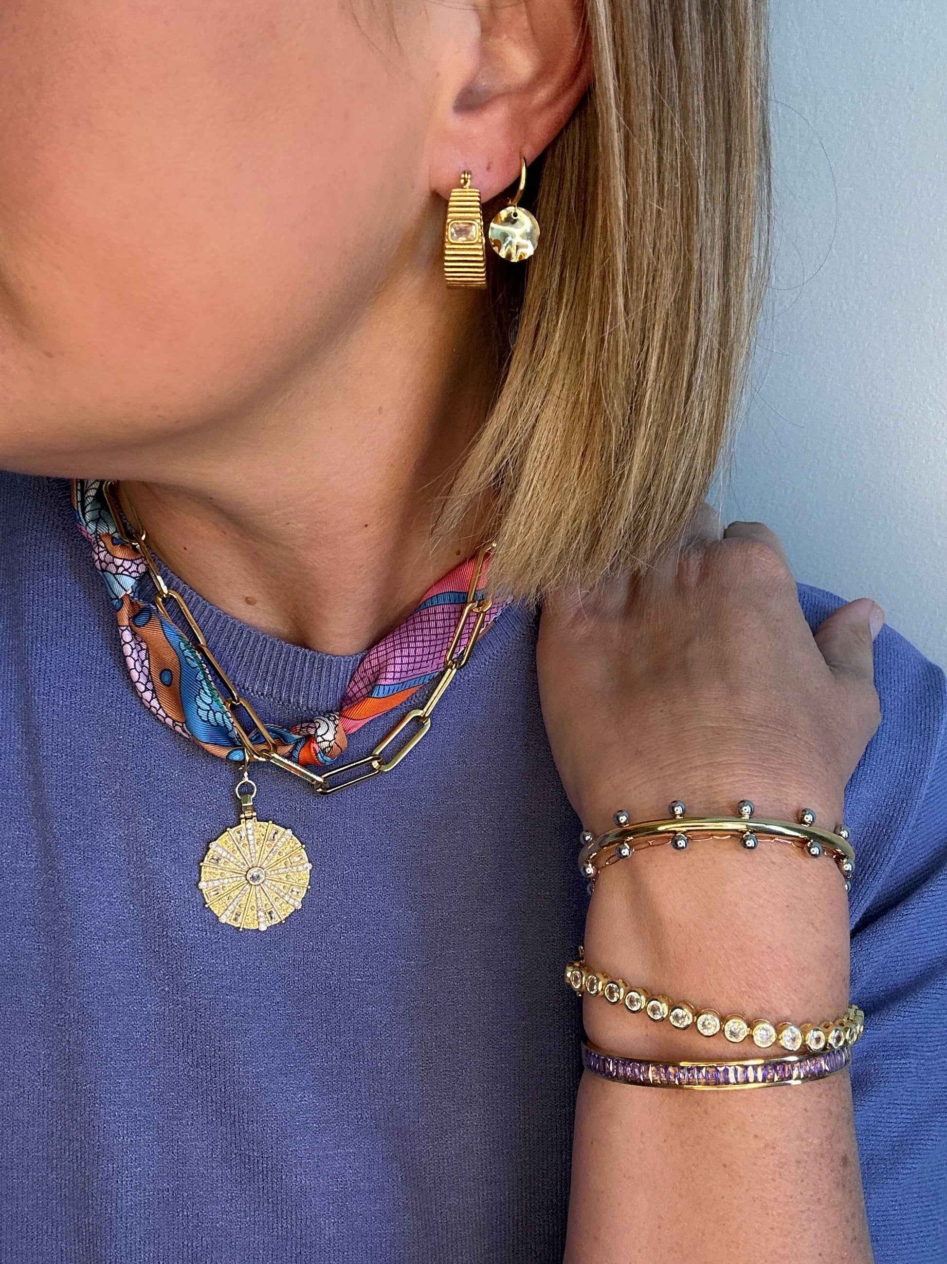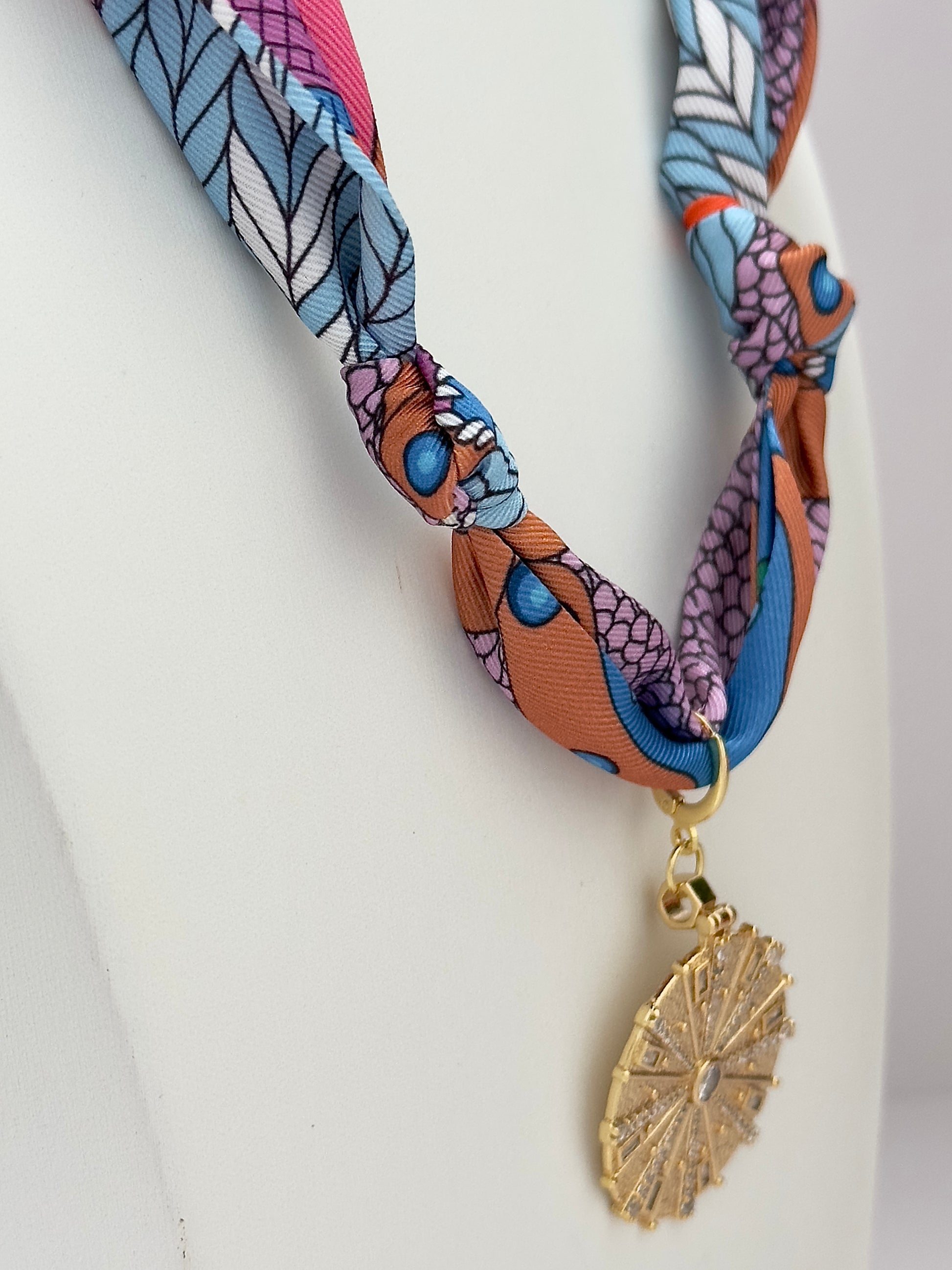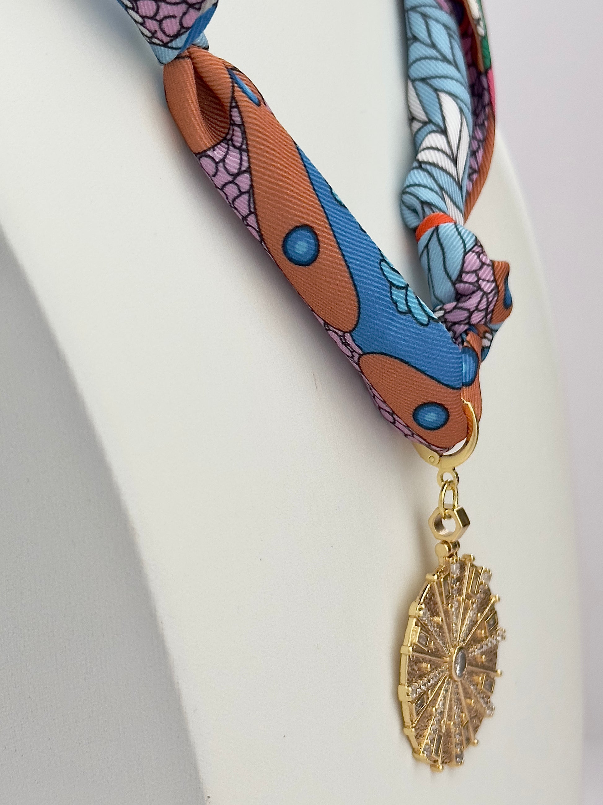 Introducing our Satin Scarf Tie Necklace featuring a round 1" medallion of 18k gold plating and sparkling CZ gems. This playful accessory adds a touch of charm to your outfit with its 24" scarf length and easy tie closure (no clasp), you tie at the length you desire. Scarf colors include pink, blue, orange, cream, and green.