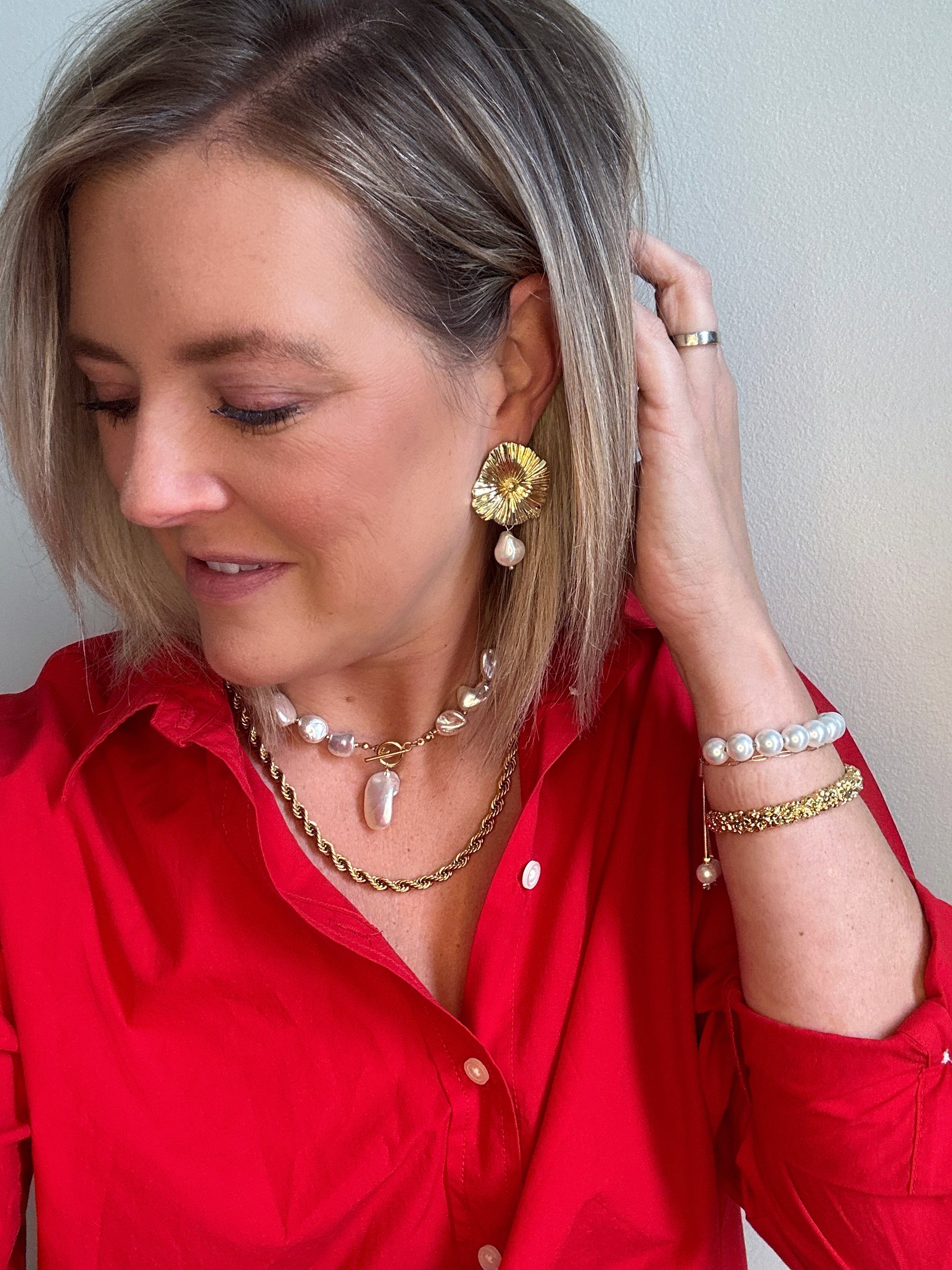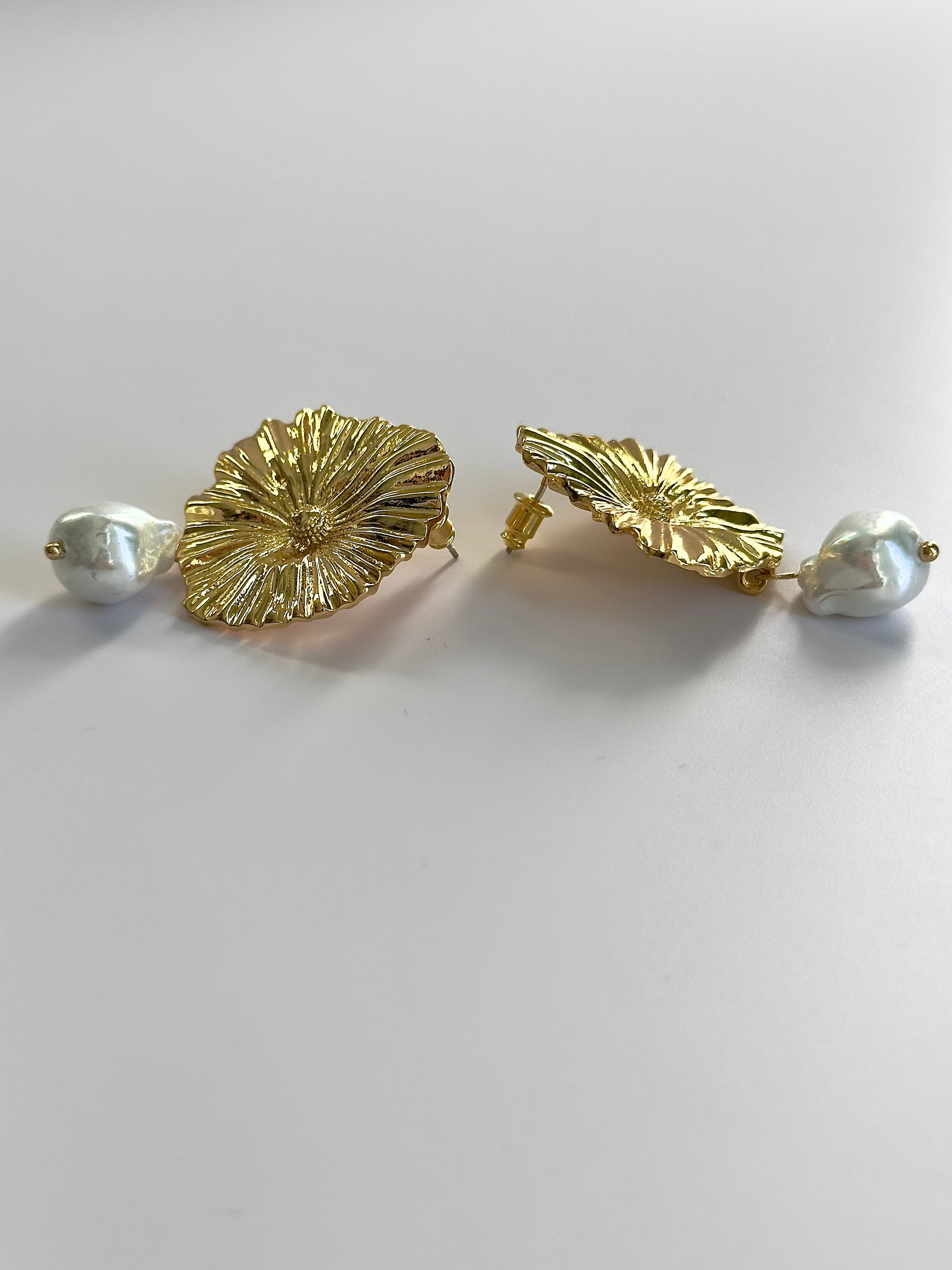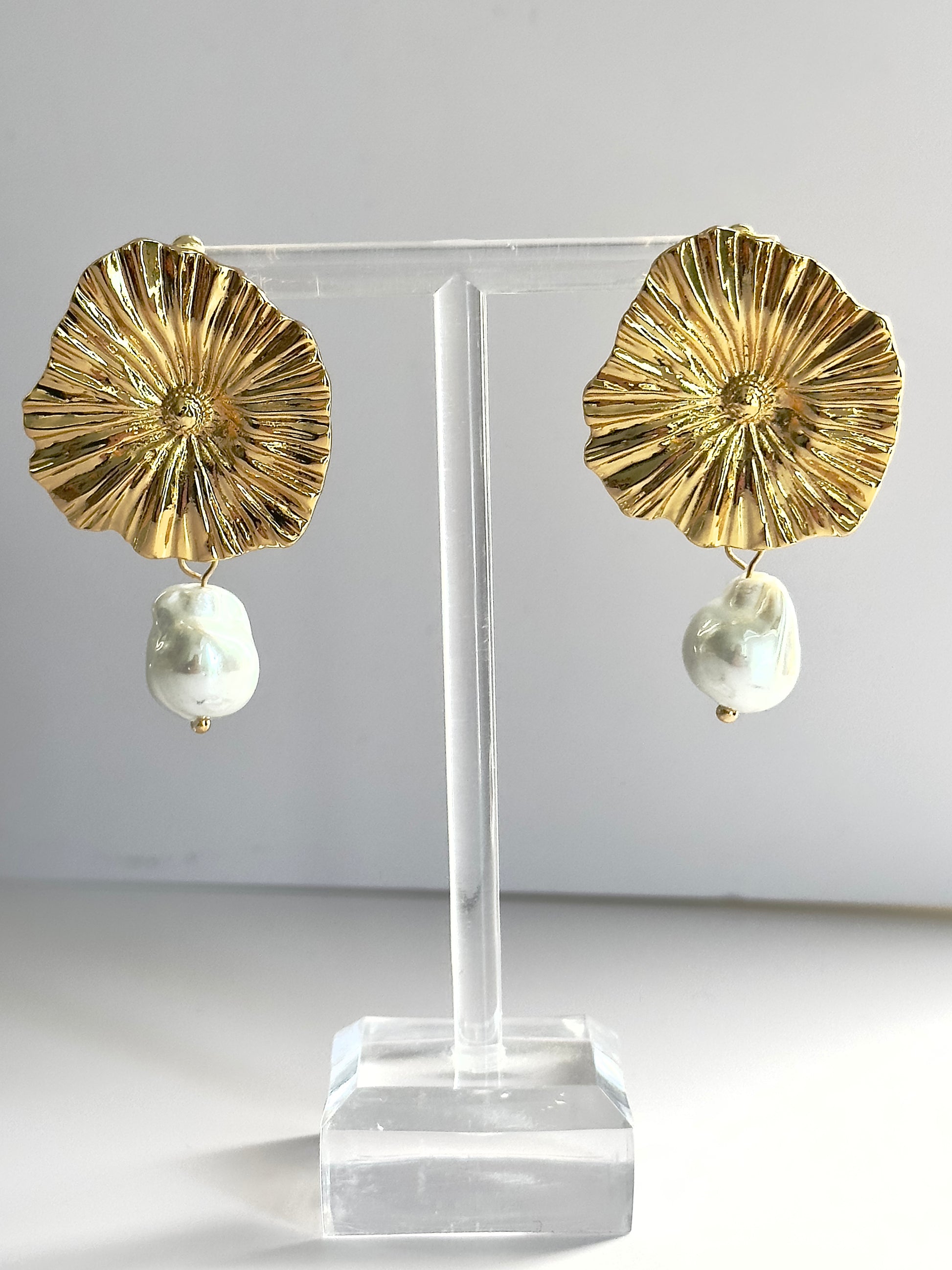 Featuring a chic gold plated round design with a dangling pearl shell accent, these 2" earrings are an absolute showstopper! Make a bold and stylish statement with these stunning pieces.