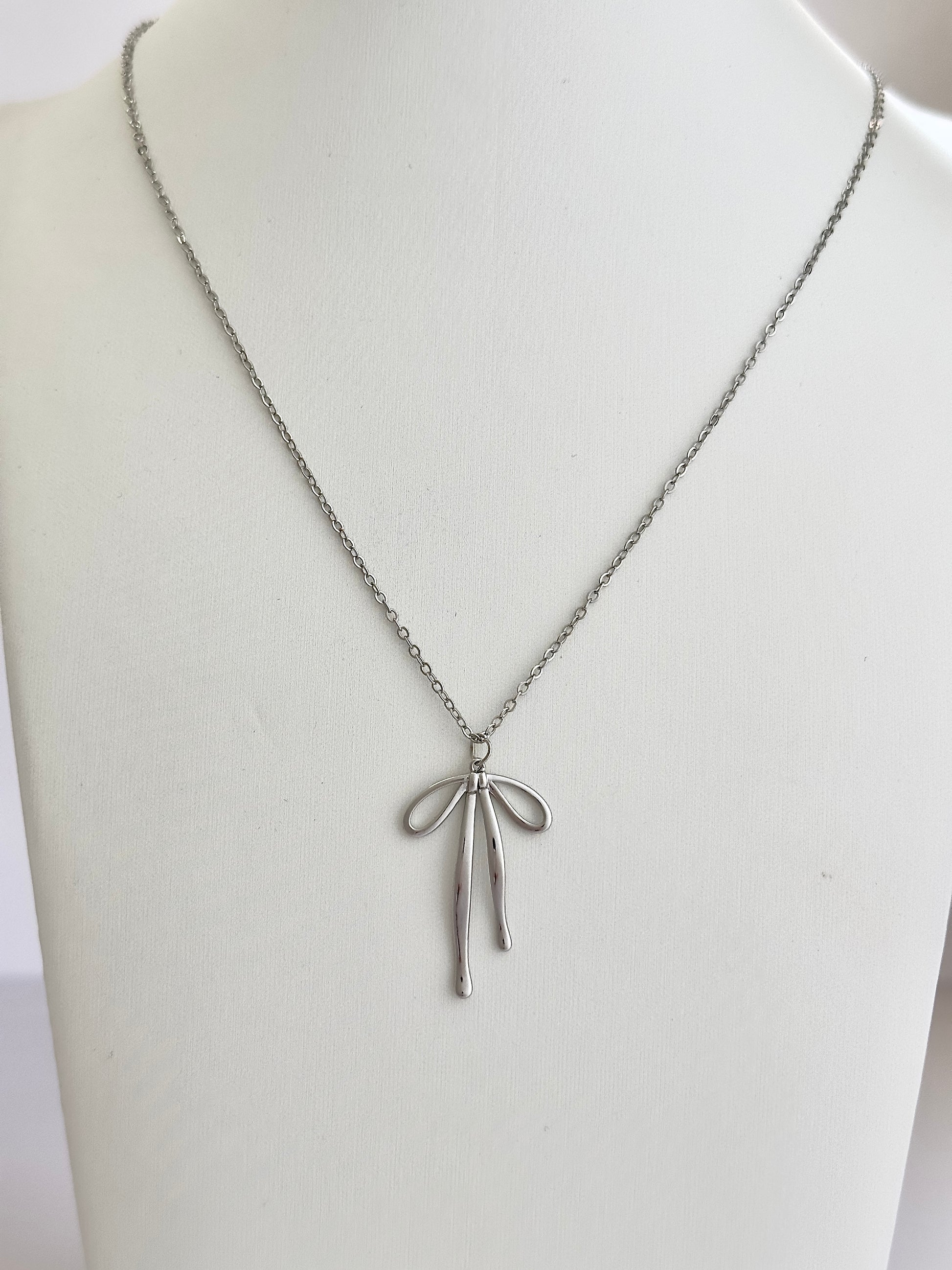 ONLY 1 LEFT! This stunning necklace features a beautiful silver rhodium-plated bow on a silver-plated chain that can be easily adjusted from 17" to 19". It is also nickel and lead-free, making it a safe and stylish choice for any occasion!
