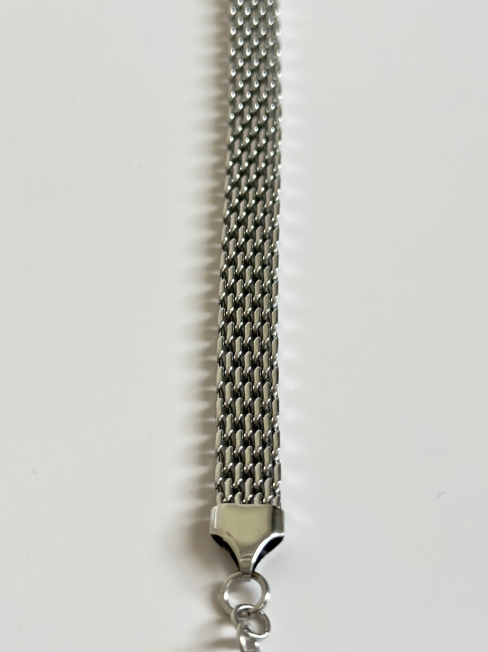 Elevate your jewelry collection with this exquisitely crafted braided silver bracelet. Engineered from premium waterproof stainless steel and finished with white rhodium plating, this piece combines refined aesthetics with practical durability. The intricate braided pattern showcases meticulous attention to detail, offering a sophisticated silhouette that transitions seamlessly from day to evening wear. Hypoallergenic and nickel-free, it's designed for discerning wearers who prioritize both style and comfort. Featuring a 15cm length with a 1" adjustable extender and a refined 5mm profile, this timeless bracelet is an investment in enduring elegance.