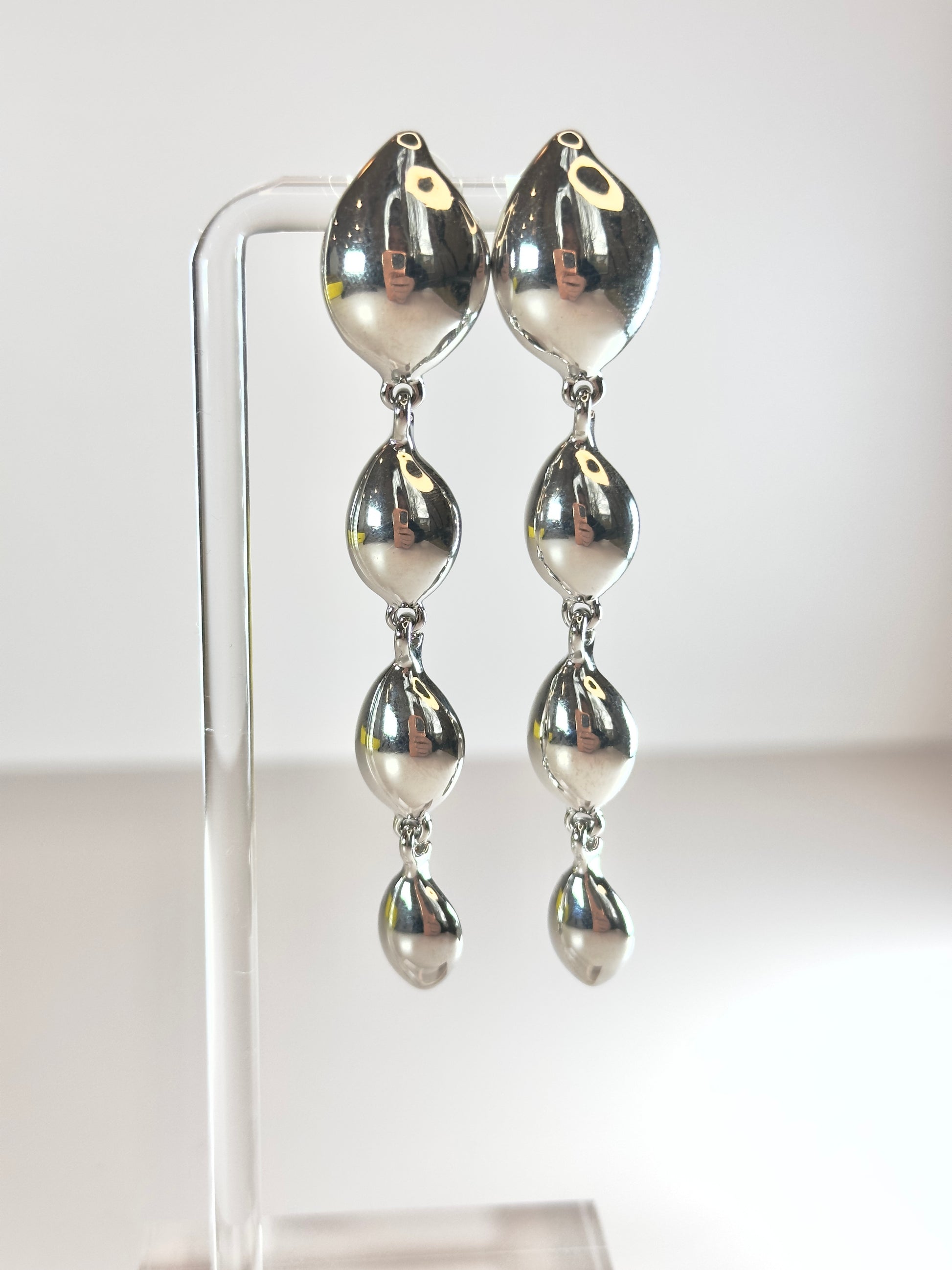 ONLY 1 PAIR LEFT! Experience the charming and refined charm of these precisely designed 3" earrings, delicately crafted with 18K Gold Plating. Silver drops that will surely captivate attention. An earring suitable for all occasions.